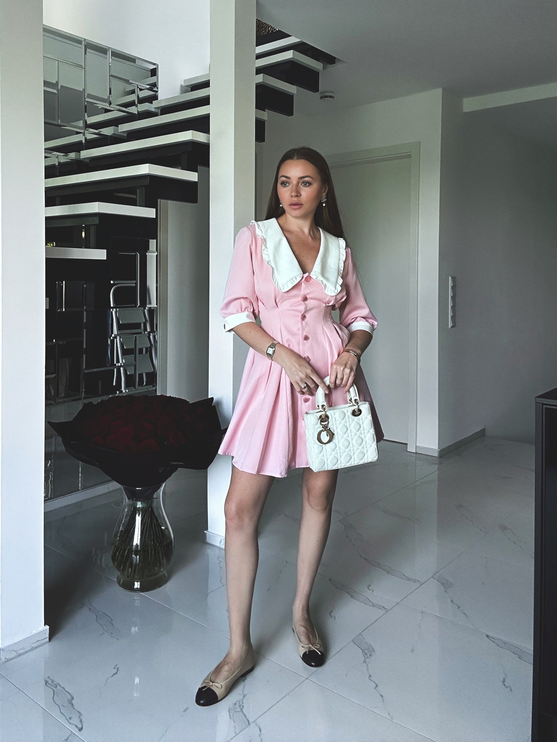 - Farbe: Hellrosa mit weißem, großen Kragen mit Rüschen