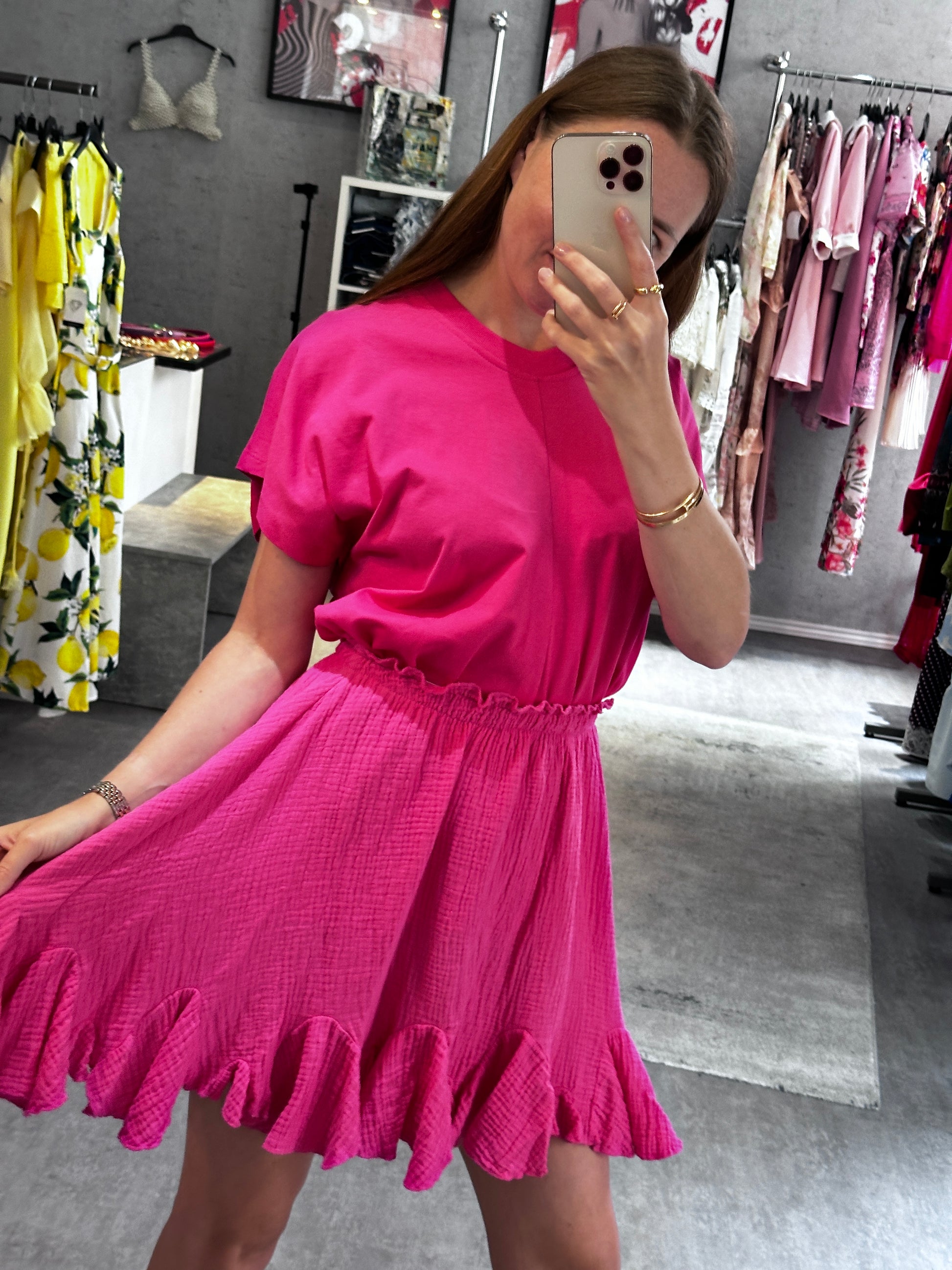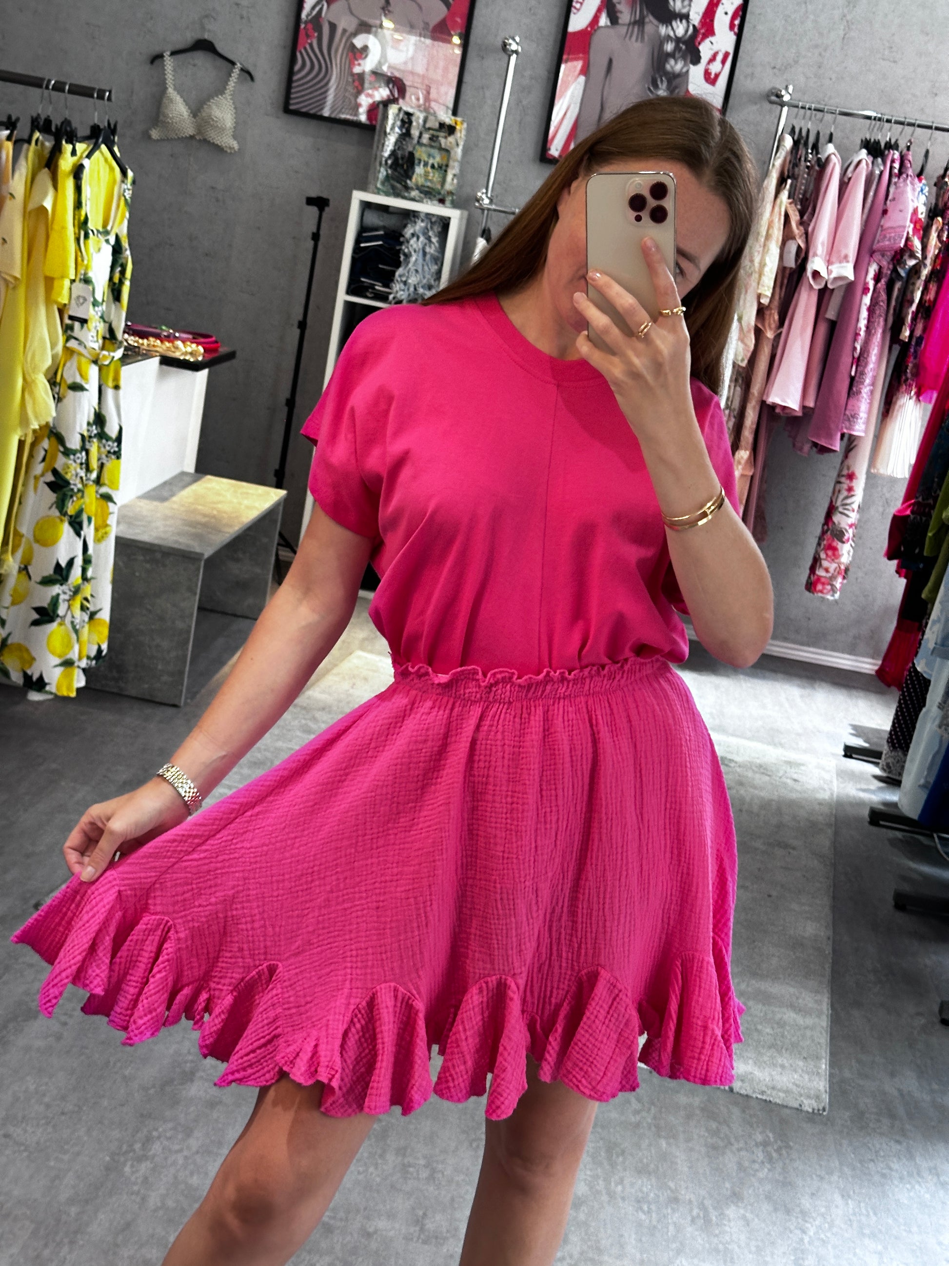 Dieser feminine Rüschenrock aus weicher Baumwolle bringt Leichtigkeit und Farbe in deinen Look! Der elastische Bund sorgt für eine bequeme Passform – passend von Größe XS bis XL.