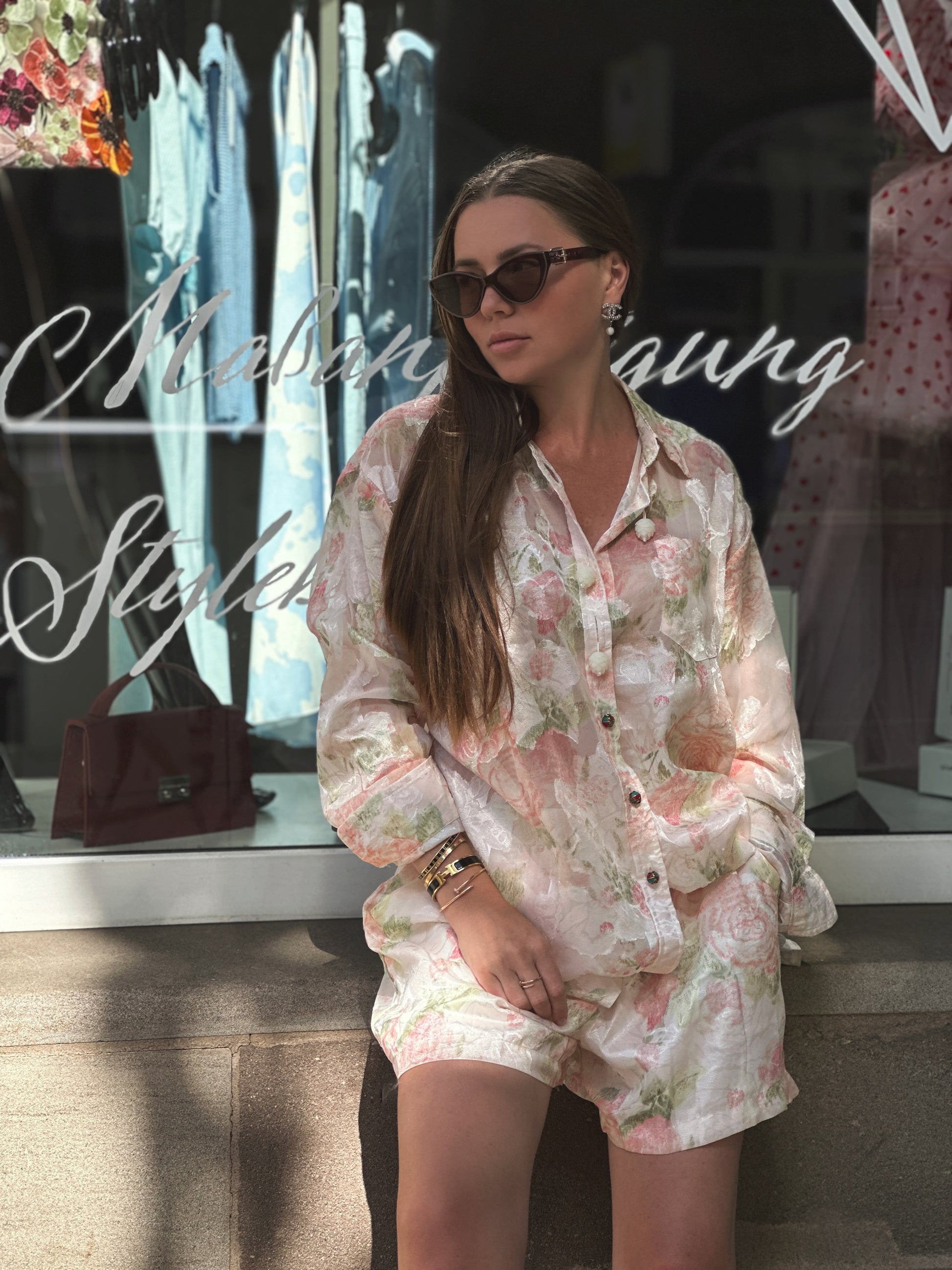 Dieser leichte Zweiteiler im romantischen Blütenprint ist der perfekte Begleiter für warme Tage. Das Set besteht aus einer locker geschnittenen Bluse mit Knopfleiste und einem passenden Shorts mit elastischem Bund.